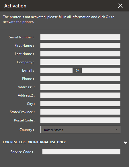 If the printer is not yet activated, a dialog will appear requesting user information for activation.