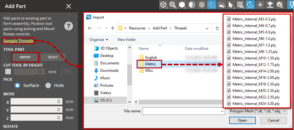 Note: You can access the preset tool parts via a convenient “Sample Threads” link within the dialog.
