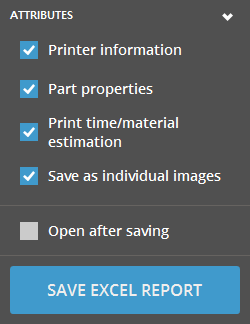 Create an Excel report from the Print tab for all printable items on the current Print Platform. This report Includes selectable parts and printing information.