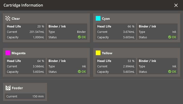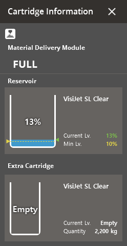 The Check Cartridge command shows the material level of installed cartridges, it also checks if the cartridge is properly inserted.