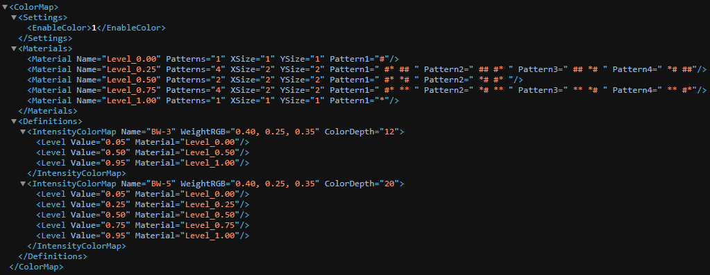 Tip: Within the color map file, you can specify your own custom pattern, such as in the 5level_12.colormap file, and reference it in the color map definition. Alternatively, you can use a standard mix pattern named PartMix{n}, as seen in the partmix_linear.colormap file.
