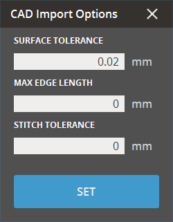 When importing CAD files, you can use the CAD Import Options to set tolerances for converting faces in the CAD files into meshes. The following options allow you to import the CAD data into the application without losing any important surface information.