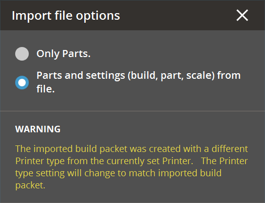 When importing an SLS Build File (.bpz), if the current printer setting do not match those in the .bpz file you will be given an option to import the parts only (if an SLS printer is currently selected) or import the part and change the printer settings to match those in the build packet, where able.