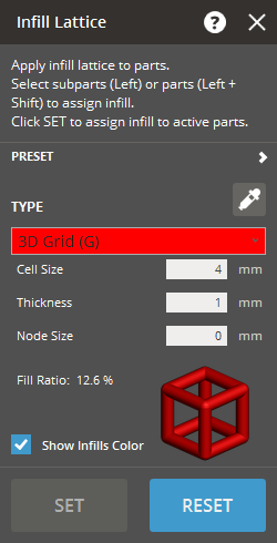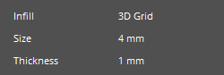 Thickness - After cell size is chosen, the user should set the thickness (of the lattice "bars"). The thickness should be greater than .75mm to maintain rigidity. You will need to keep an eye out for infill density as you adjust thickness. If the infill density exceeds 25% or the user’s expectation, the user should select a lower density pattern, or increase the cell size. If the cell size is already at a minimum, then the part may not be suitable for an infill pattern or the pattern will not connect in three axes.