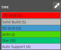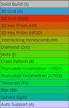The three patterns available in 3D Sprint, in order of increasing relative density, are Grid < Jacks < Star (at same cell size, thickness). Auto Support and Solid Build are also available and offer a hollow (no infill lattice) or solid part respectively.