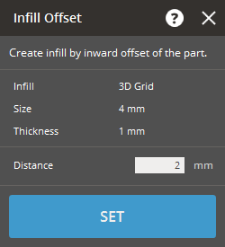 Interior shells can be easily created with the Offset command under the Infill toolset. The preset lattice settings will be applied to core of the offset part. The lattice presets can be changed under the Lattice command. In this window, distance refers to the wall thickness of the shell you are creating.