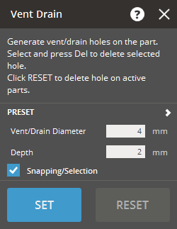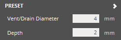 Enter a vent / drain diameter and depth in the parameters. Position the mouse pointer over a part to see a preview of the size.