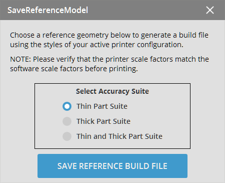 The Load Reference Models command loads a set of ready to print models to the Print Platform that can be measured for creating a reference build for use with the Build Style > Scale and Offset Wizard.