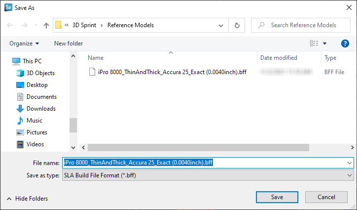 Click Save Reference Build File to save the reference models as BFF file (SLA Build File Format).