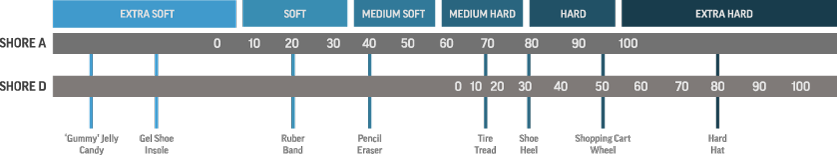 Shore A (A) values range from Extra Soft to Extra Hard.