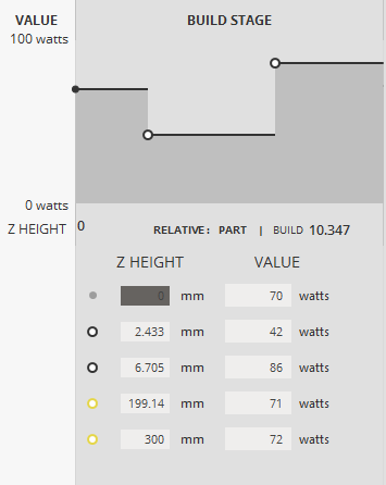For each parameter, you can tell the system what values to use at various Z levels during the stage of the build; this is called a profile. You can click to create a point on each stage to create a row in the table for the each Z height when the parameter should change. The values of points can be changed by either modifying the values below the graph or by clicking and dragging the points on the graph. To delete a point, select it by clicking it on the graph and press delete from the popup dialogue. If you intend for a parameter to use the same value throughout a build, its table should have only one row, with a Z height of 0.000 and the desired value. |