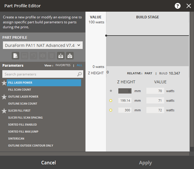 By default, the Part Profile assigned is defined during the configuration of printer and materials when setting up printer in the Printer command. However the Part Profile Editor allows you to create a new profile or modify an existing one to assign specific part build parameters to parts to define the behavior of the build at various Z levels during the print. Part Profiles can be assigned to selected parts of a print build. You set part parameters and create part profiles with the Part Profile Editor, launched from the Print tab.