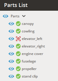 Each part can consist of one or several subparts, which are separate meshes (clusters) in the part. A polygonal mesh file assembly may have several subparts included. Subparts are not visible and cannot be selected in the Parts List tree.