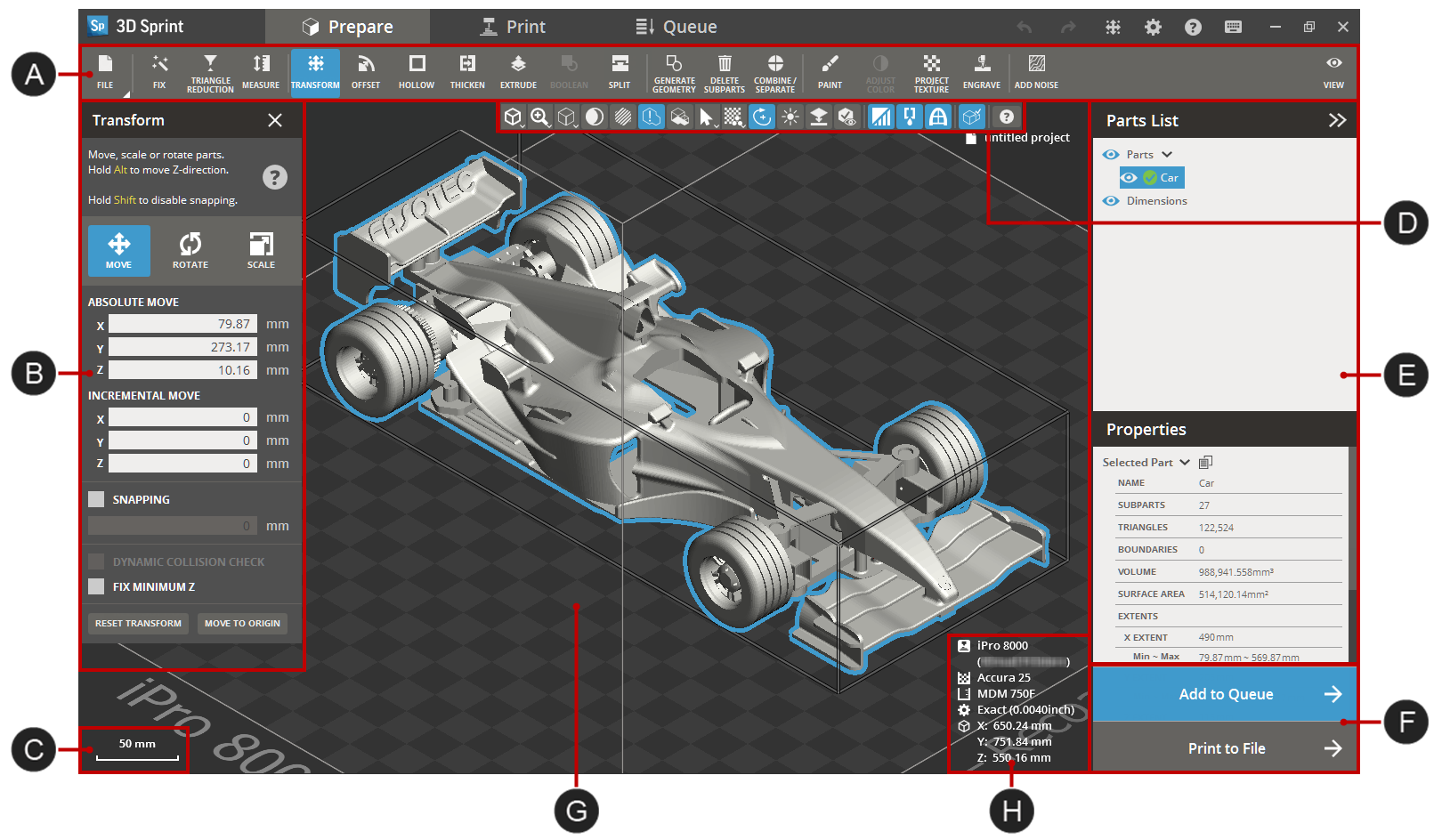 Send parts to the Queue for printing or save a print project as a print build file. See Printing Parts in the Print tab for more information.