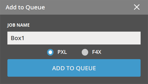Select one of .PXL and .F4X file types. A build can be saved as .PXL or .F4X file when printing parts to file or sending them to Queue. The default is .PXL file.