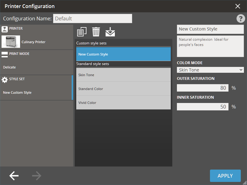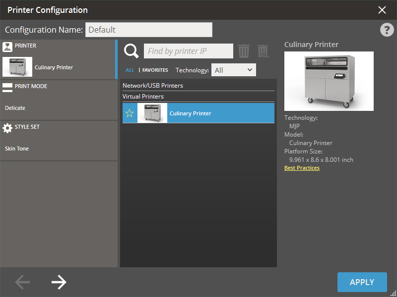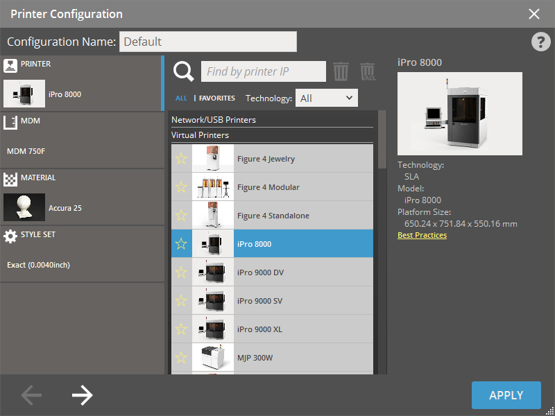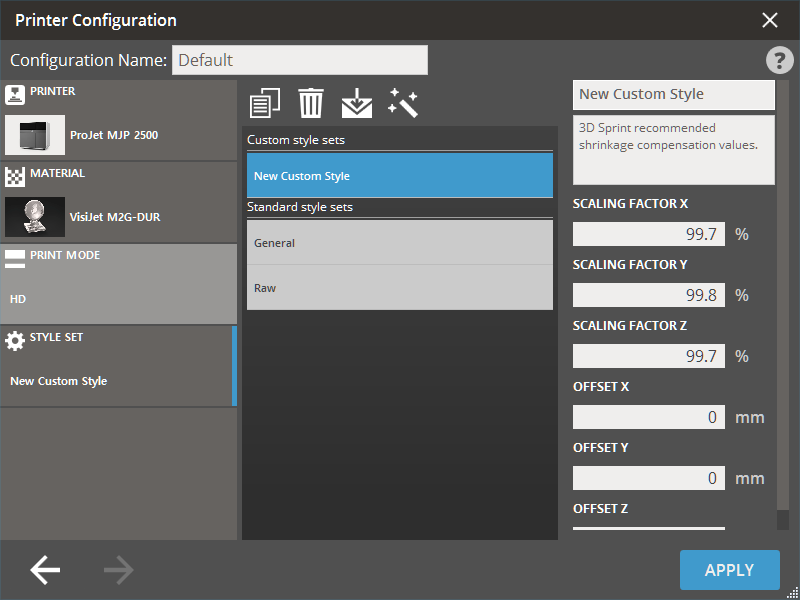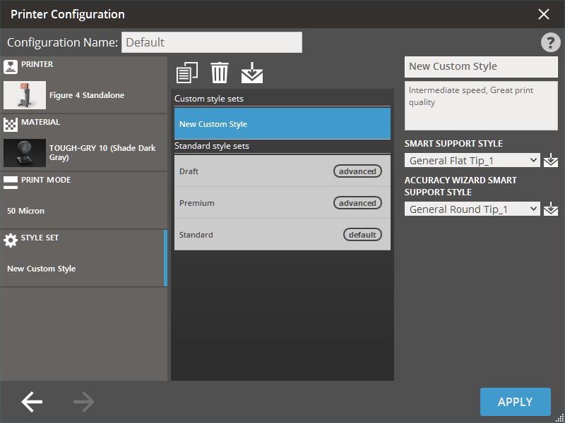 After moving through the each step to set up material, print mode and build style for the printer and clicking Apply. These options will be the default for that printer and will be remembered the next time the printer is selected.