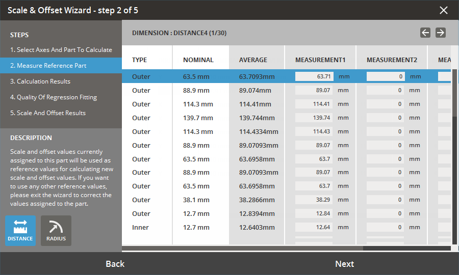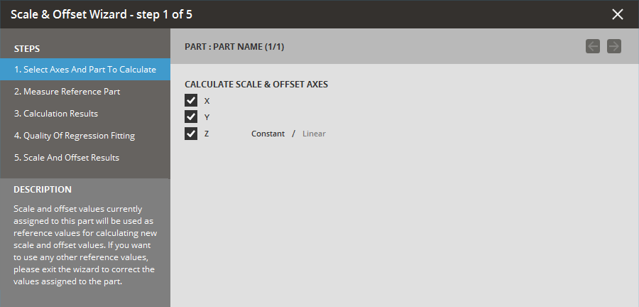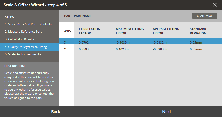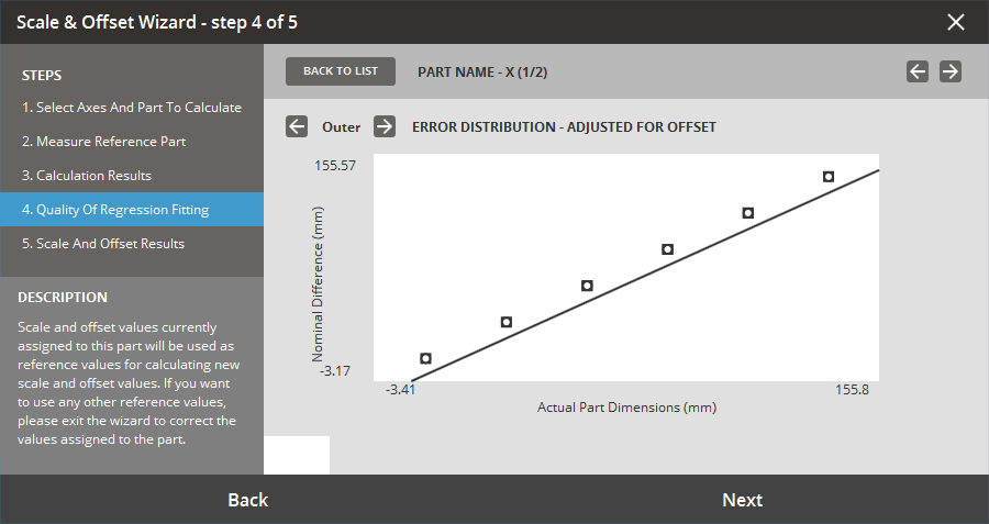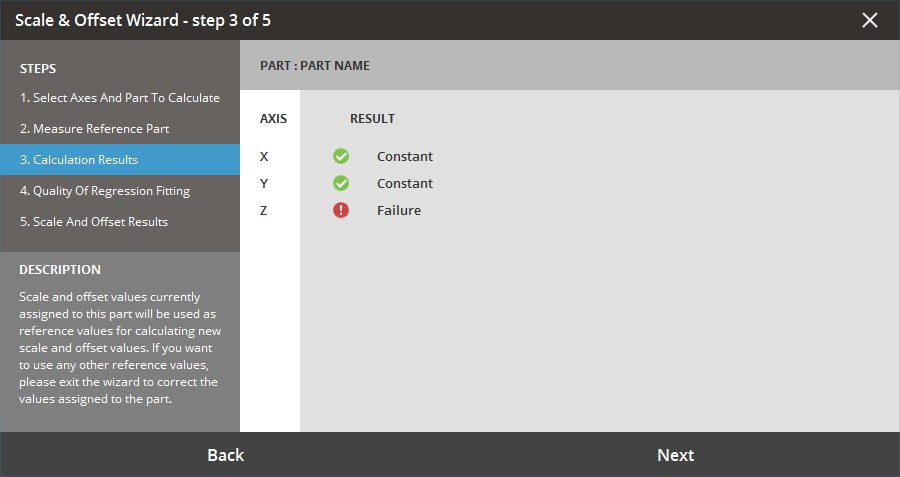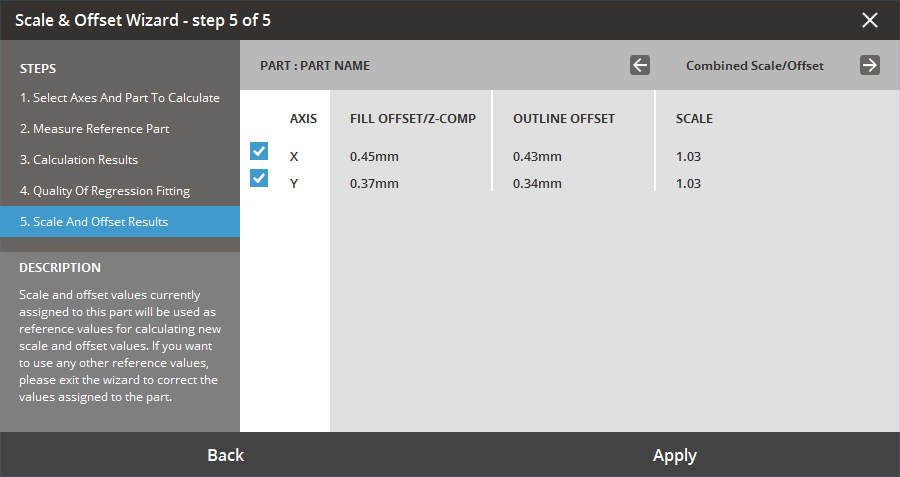 The system displays the Scale and Offset Results. Review the results and select the parts and axes you want to apply the scale factors to. Step 5...