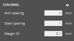 Margin XY (Min. 0.05mm - Max. 2mm; Default is 0.1mm) - Controls the X and Y margins between stacks and the perimeter of the platform.