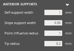 Slope Support With (Min. 0.05mm - Max. 2mm; Default is 0.05mm) - The radius of range where the lower layer can support upper layer. A smaller value can cause more anchor points to be generated, and a larger value can cause less anchor points to be generated.