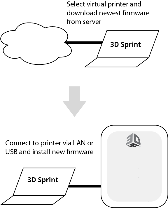 Some printers are on a network that is not connected to the internet. In those cases, a virtual printer can be used to download the firmware. After downloading, connect to the printer and install the firmware on the offline network (or via USB).