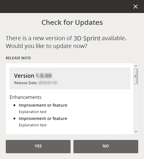 Every time 3D Sprint is launched it will check for updates. If updates are available, a dialog will appear guiding you through the installation.
