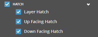 Layer Hatch - Shows or hides internal hatch layers of the part. Up Facing Hatch - Shows or hides upward facing hatch of the part. Down Facing Hatch - Shows or hides downward facing hatch of the part. QuickCast Diamond Hatch - Shows or hides hatch of the part for QuickCast Diamond Build Style. Note: The QuickCast Diamond Hatch option is available for materials that support QuickCast Diamond build style. |