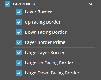 Layer Border - Shows or hides border of a layer. Up Facing Border - Shows or hides upward facing layer border. Down Facing Border - Shows or hides downward facing layer border. Layer Border Prime- Shows or hides outer border of a layer. Large Layer Border - Shows or hides inner border of a layer Large Up Facing Border - Shows or hides upward facing inner border of a layer. Large Down Facing Border - Shows or hides downward facing inner border of a layer. |