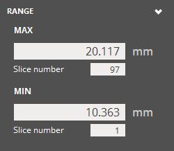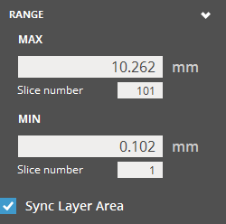 Max - Upper value of the selected range. Slice number - The slice number of the upper value of the selected range Min - Lower value of the selected range. Slice number - The slice number of the lower value of the selected range Sync Layer Area - Toggle to synchronize the layer area view between the View Slice command and the Layer/Scan Time window. Note: This option is available when the Layer/Scan Time window is open. |